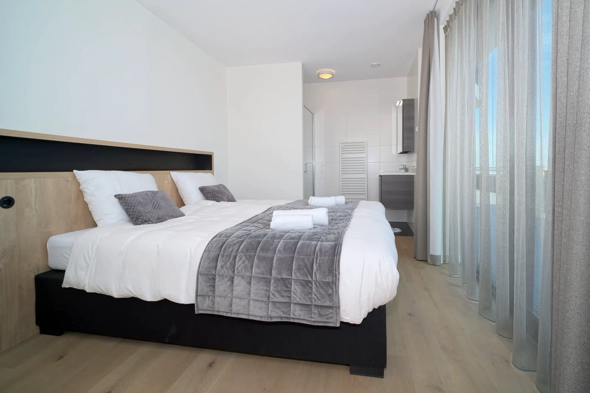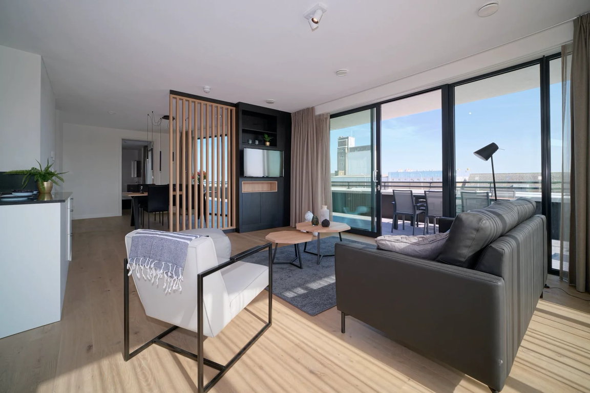 Die geräumige Ferienwohnung Starfish Terrace von Dormio Breskens Appartments & Penthouses besticht durch ihre Ecklage mit Blick auf Breskens und den Hafen. Auf einer Nutzfläche von ca. 102 m2, zugänglich über Treppe oder Aufzug, bietet die 3-Zimmer-Ferienwohnung Komfort und Luxus für bis zu 4 Personen mit 2 Schlafzimmern und 2 Badezimmern. Die modern eingerichtete Ferienwohnung verfügt über ein großzügiges Wohnzimmer mit Essecke und Sitzecke, ausgestattet mit einem Smart-TV mit Streaming-Funktion. Die offene Küche bietet alles, was Urlauber benötigen, einschließlich Kühl-Gefrier-Kombination, Kombi-Backofen, Nespresso-Maschine und Geschirrspülmaschine. 2 Schlafzimmer, jeweils mit einem Doppelbett und einem En-Suite-Badezimmer, sorgen für Privatsphäre und Bequemlichkeit. Ein En-Suite-Badezimmer verfügt über eine begehbare Dusche, Doppelwaschbecken und Toilette, während das andere Badezimmer eine Dusche und ein Waschbecken bietet. Eine separate Toilette ist ebenfalls vorhanden.