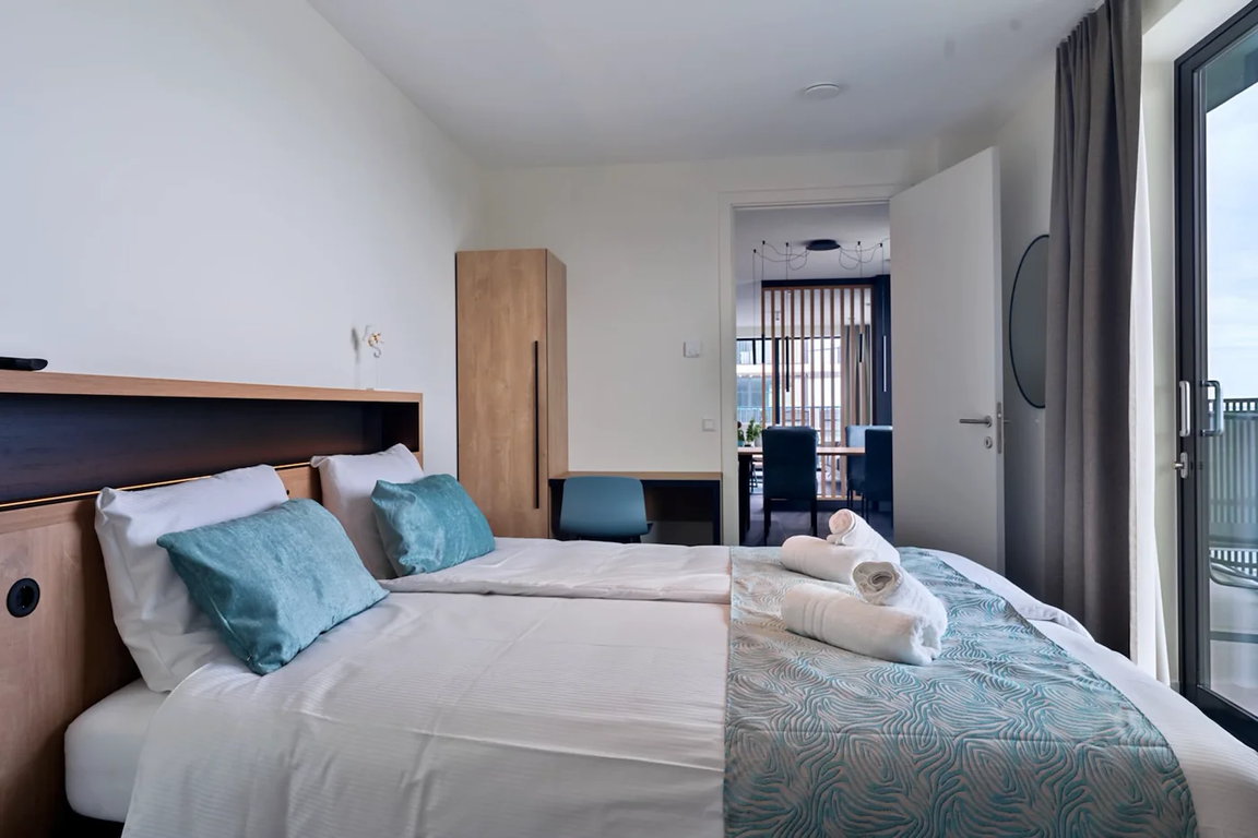 Die Ferienwohnung verfügt zudem über 2 Schlafzimmer, jedes mit einem Doppelbett und einem eigenen En-Suite-Badezimmer. Ein En-Suite-Badezimmer ist mit begehbarer Dusche, Doppelwaschbecken und Toilette ausgestattet, während das andere Badezimmer über eine Dusche und ein Waschbecken verfügt. Eine separate Toilette ist ebenfalls vorhanden. Ein Abstellraum mit Waschmaschine und Trockner steht zur Verfügung, ebenso wie kostenloses WLAN während des Aufenthalts. Darüber hinaus können Mieter ihr Auto kostenlos in der Tiefgarage parken, wo sie auch einen allgemeinen, abschließbaren Fahrradschuppen für ein eBike vorfinden. Einige Ferienwohnungen bieten zusätzliche Parkplätze oder private Ladestationen für Elektroautos.