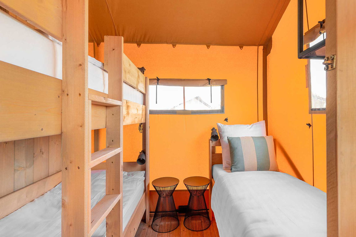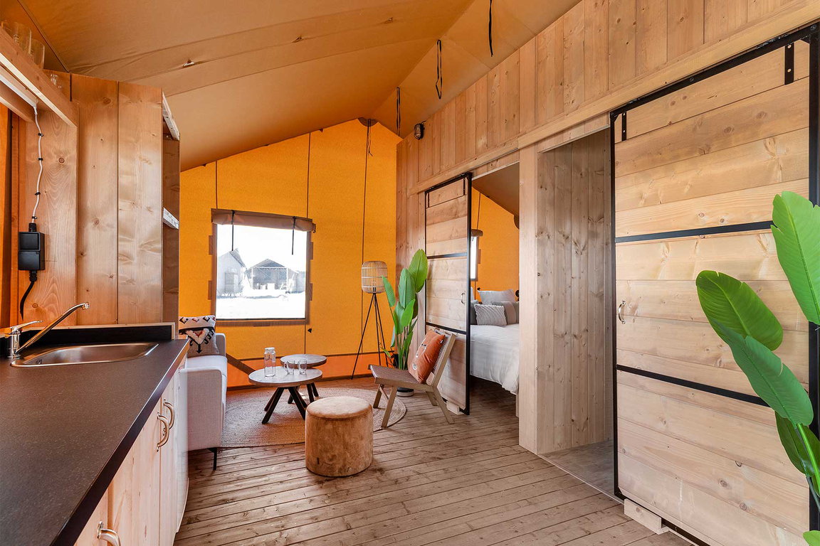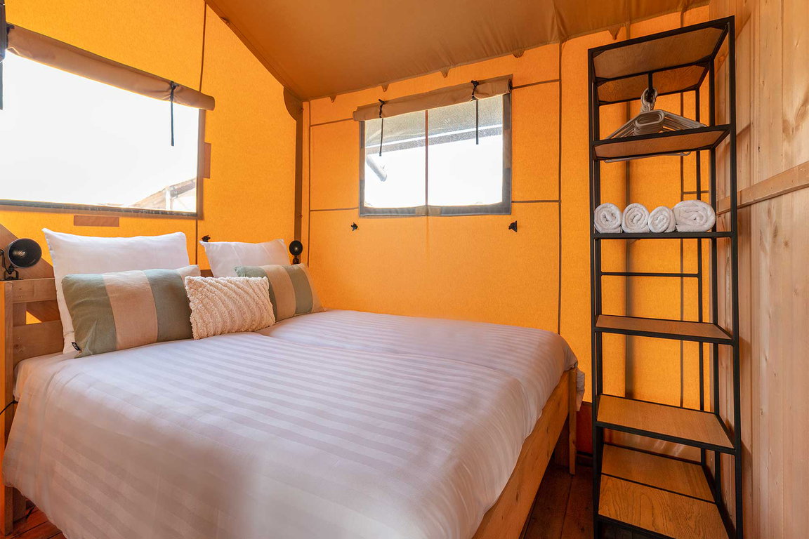 Im bezugsfertig eingerichteten Safarizelt „Kievit“ im Ferienpark „Waterdunen“ bei Breskens urlauben bis zu fünf Personen beim Glamping: Mitten im Naturschutzgebiet „Waterdunen“ in richtigen Betten schlafen, Frühstück am Tisch drinnen oder auf der Terrasse und ein eigenes Badezimmer mit Toilette – alles in einem luxuriösen ca. 40 qm großen Zelt. Das Glamping-Zelt „Kievit“ bietet zwei Schlafzimmer, davon eines mit Doppelbett, das andere mit einem Einzelbett und Etagenbetten, Fernseher im Wohnbereich sowie eine komplett eingerichtete Küche mit 4-Gaskochplatten, Kühlschrank mit Tiefkühlfach, Nespresso Kaffeemaschine und Wasserkocher sowie ein Badezimmer mit Dusche, Toilette und Waschbecken. Eine Veranda mit Gartenmöbeln und großem Vordach bieten zusätzlichen Outdoor-Komfort. Eine Heizung ist nicht vorhanden.