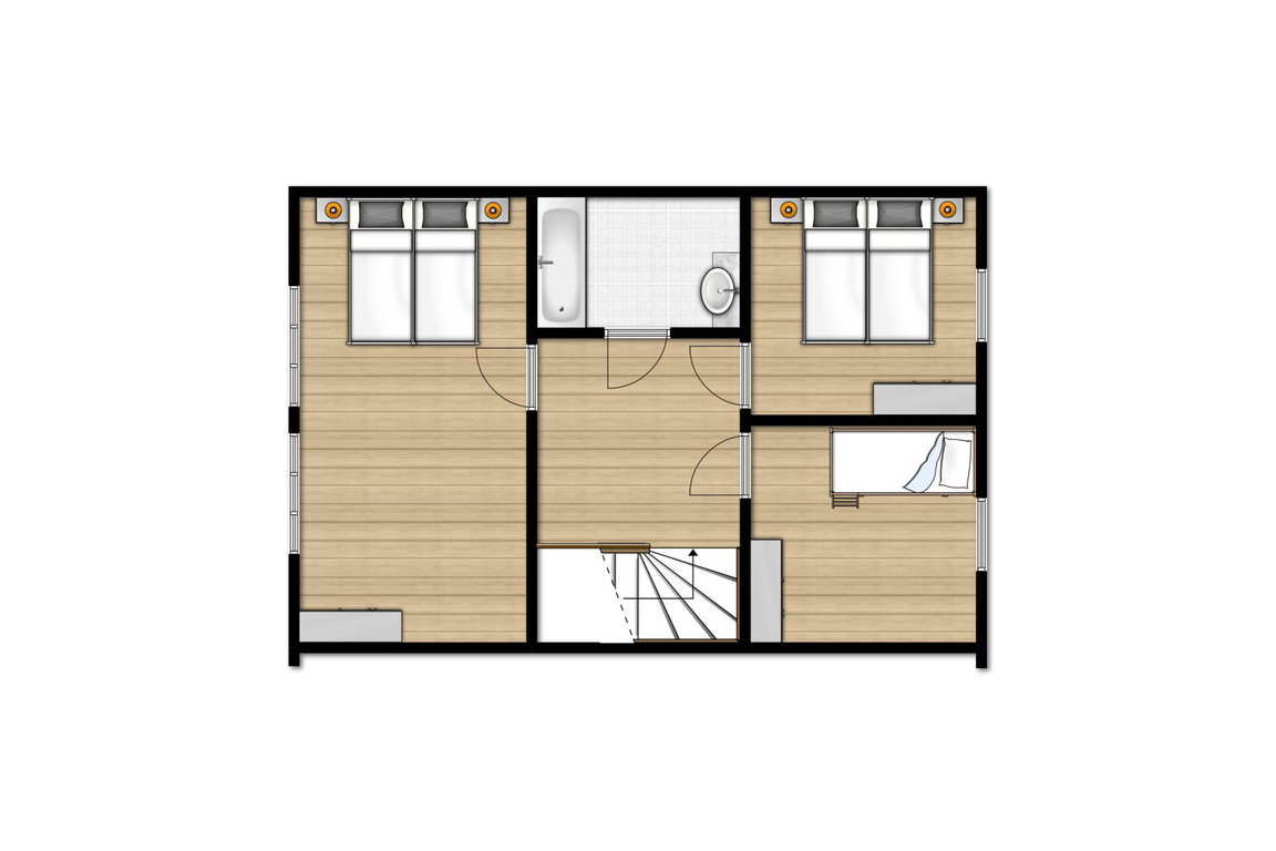 Im Erdgeschoss befindet sich eine separate Toilette, was besonders bei voller Belegung für zusätzlichen Komfort sorgt. Insgesamt stehen drei Schlafzimmer zur Verfügung: Zwei Zimmer sind mit jeweils zwei komfortablen Einzel-Boxspringbetten ausgestattet, während das dritte Schlafzimmer über ein Etagenbett verfügt. Für die kleinsten Gäste ist zudem ein Kinderbettchen vorhanden, sodass sich auch Familien mit Kleinkindern rundum wohlfühlen können. Das Badezimmer befindet sich auf der oberen Etage.