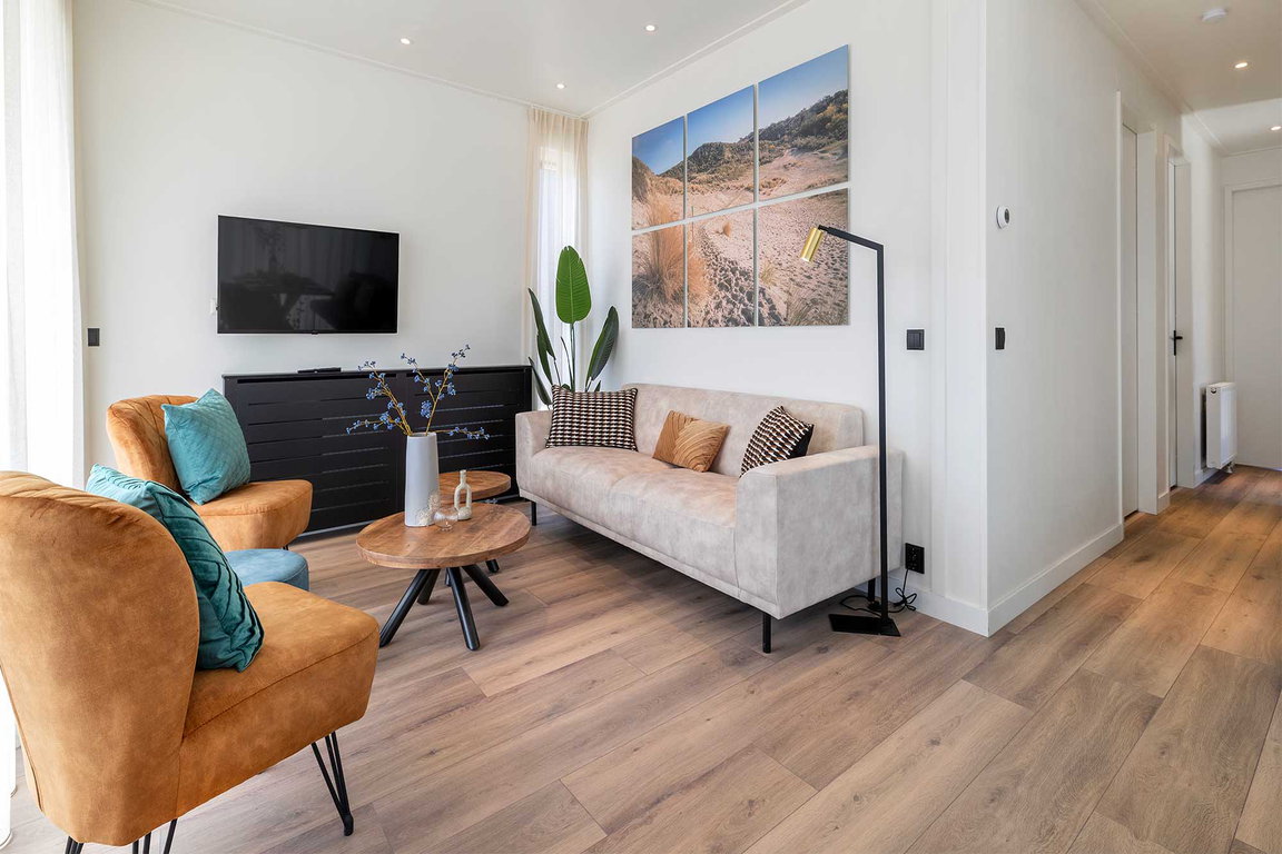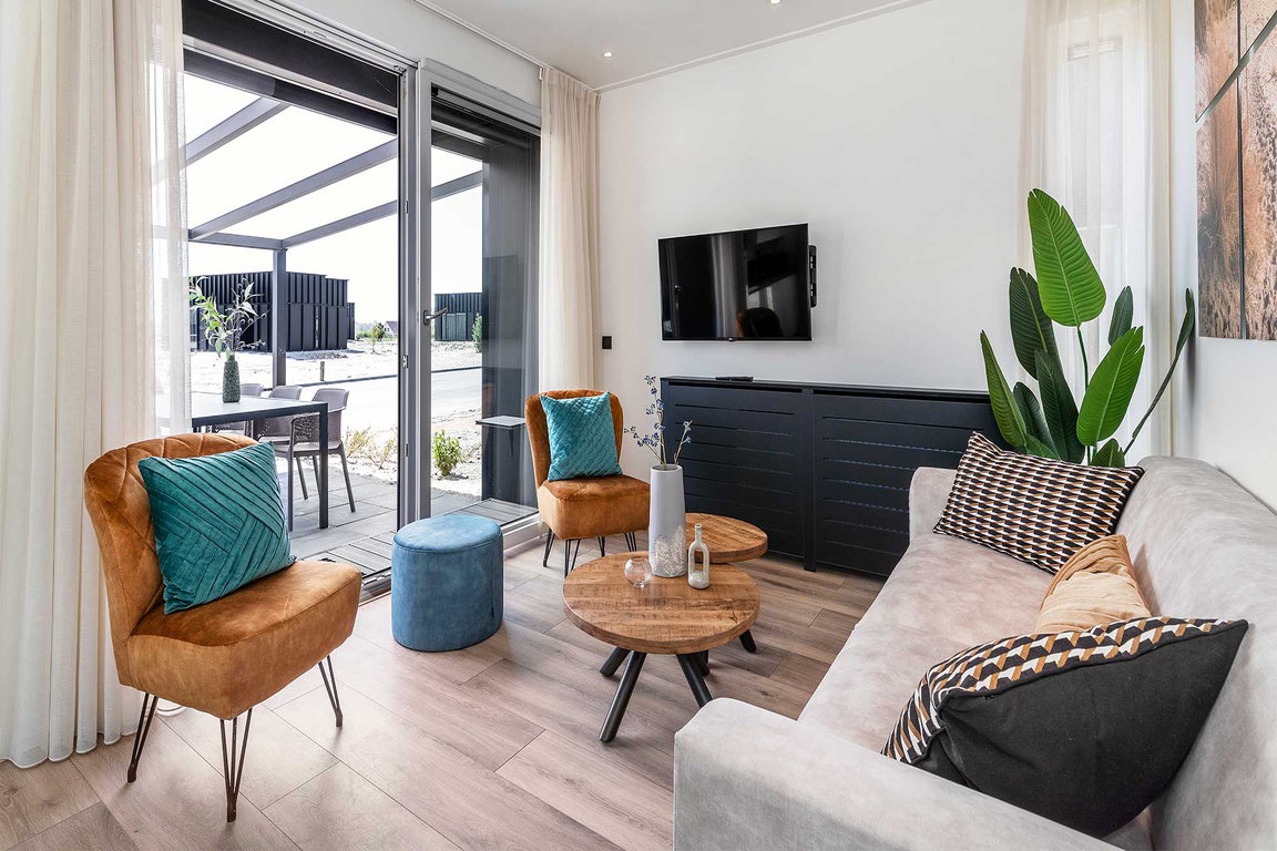 Maximal zwei Haustiere finden ebenfalls (gegen Gebühr) Platz im Ferienhaus „Turellur“ im Molecaten Park Waterdunen. Das Auto kann auf dem zentralen Parkplatz abgestellt werden; WLAN ist vorhanden.