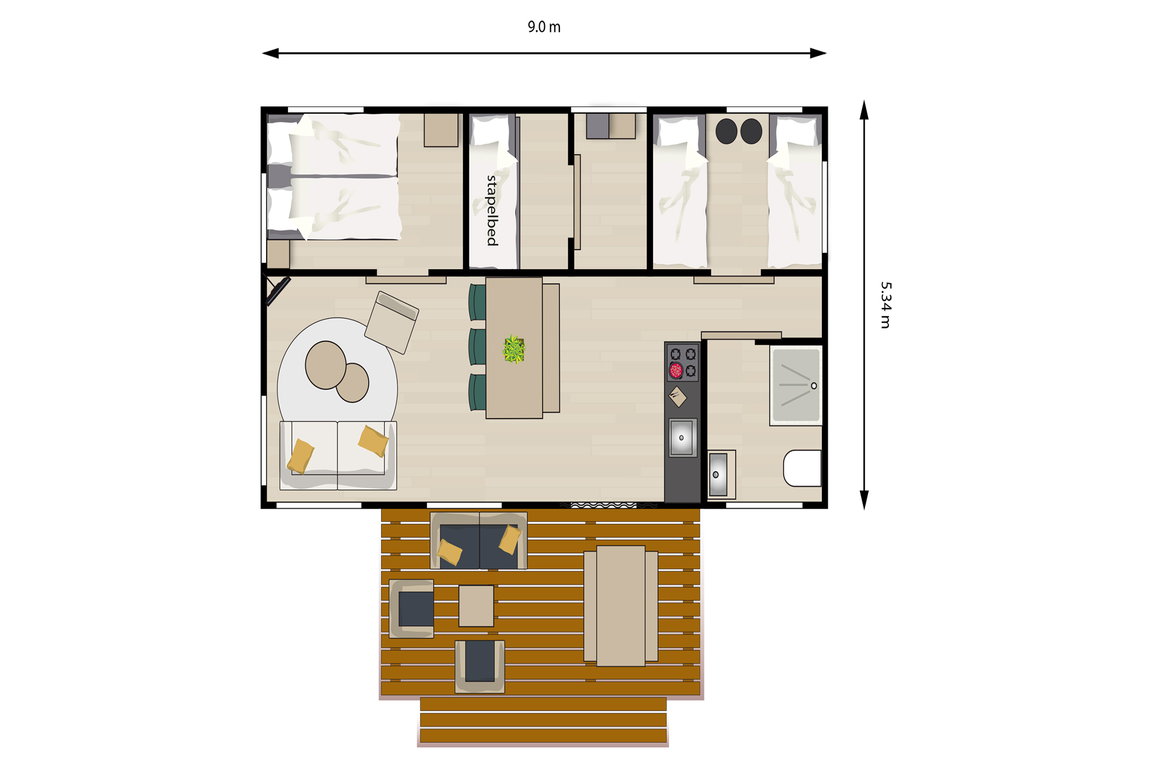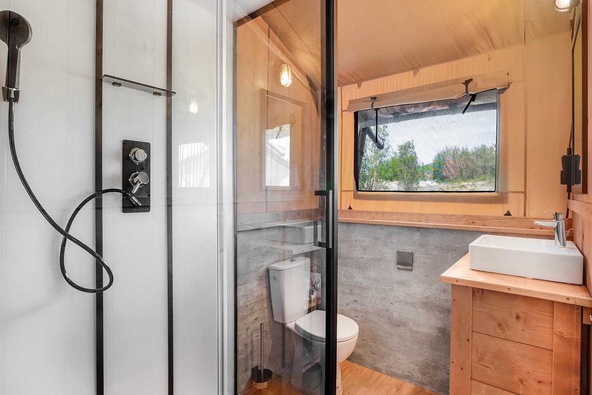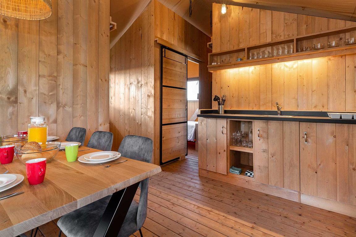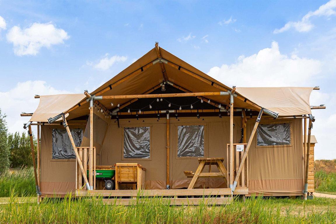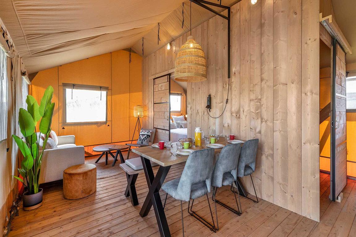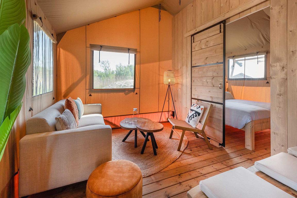 Im Safarizelt „Wulp“ im Ferienpark „Waterdunen“ bei Breskens campen Urlauber luxuriös mitten im Naturschutzgebiet und direkt am Meer. Auf eine Gesamtfläche von ca. 48 qm bieten drei Schlafzimmer Übernachtungsmöglichkeit für sechs Personen in einem Doppelbett, zwei Einzelbetten und einem Etagenbett. „Wulp“ hat zudem ein luxuriöses Badezimmer mit Dusche, Toilette und Waschbecken; die Küche ist komplett eingerichtet mit einem 4-Gaskochplatten-Herd, Kühlschrank mit Tiefkühlfach, Nespresso-Kaffeemaschine und