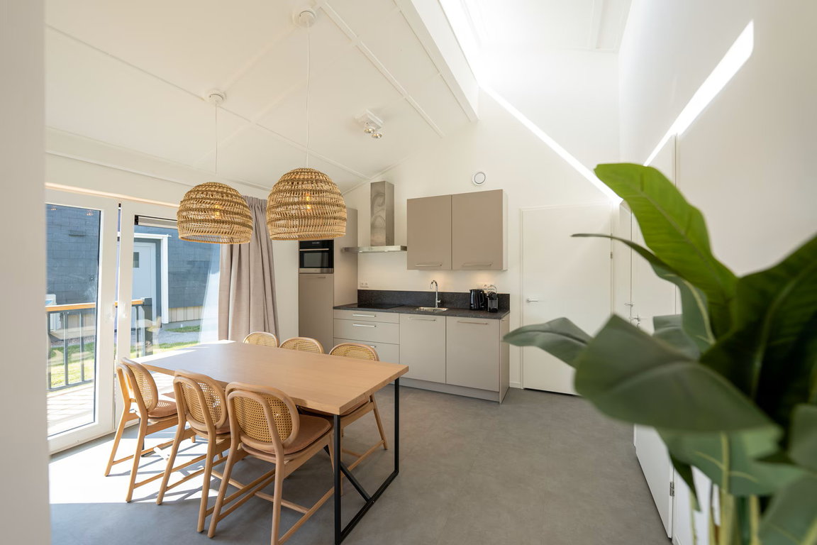 Die freistehende Villa „Luxe Wellness“ im Ferienhauspark „Zeebad“ in Breskensn bietet Platz für bis zu sechs Erwachsene und ein Kind bis vier Jahre und liegt in traumhafter Lage direkt am Wasser. Der großzügige Wohnbereich mit offener Küche ist über die einladende Vorhalle erreichbar. Eine behagliche Sitzecke mit Blick in den Garten und auf die möblierte Terrasse schafft eine gemütliche Atmosphäre. Ein Fernseher mit Streamingfunktionen sorgt für beste Unterhaltung – eigene Apps vom Smartphone oder Tablet lassen sich problemlos auf den Bildschirm übertragen. Die offene Küche ist modern und komfortabel ausgestattet: Ein Kühlschrank mit Gefrierfach, eine Kaffeekapselmaschine, eine Kombi-Mikrowelle, ein Geschirrspüler und ein Wasserkocher stehen bereit, um kulinarische Wünsche zu erfüllen.