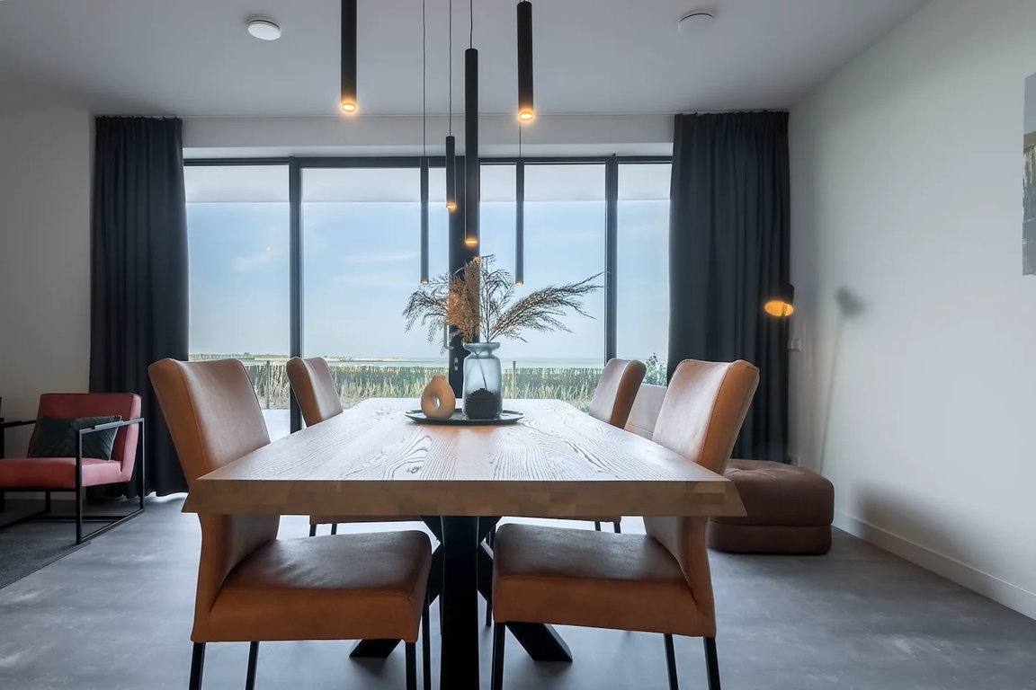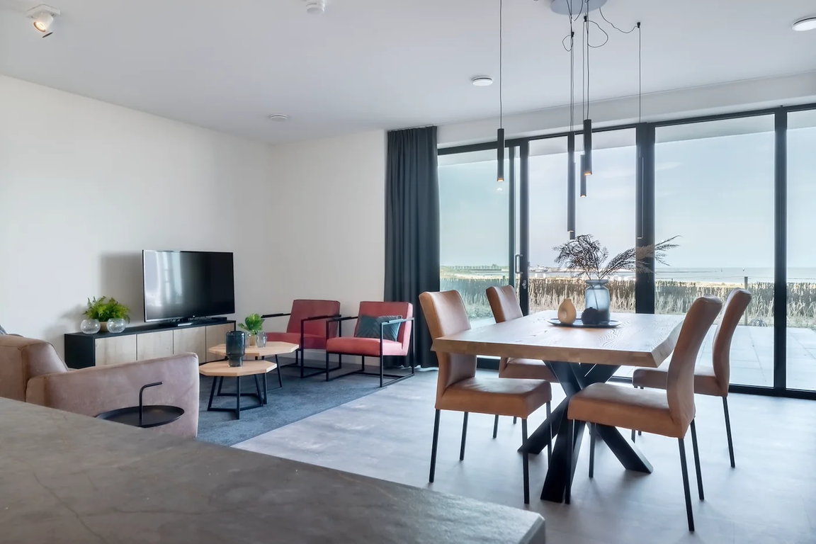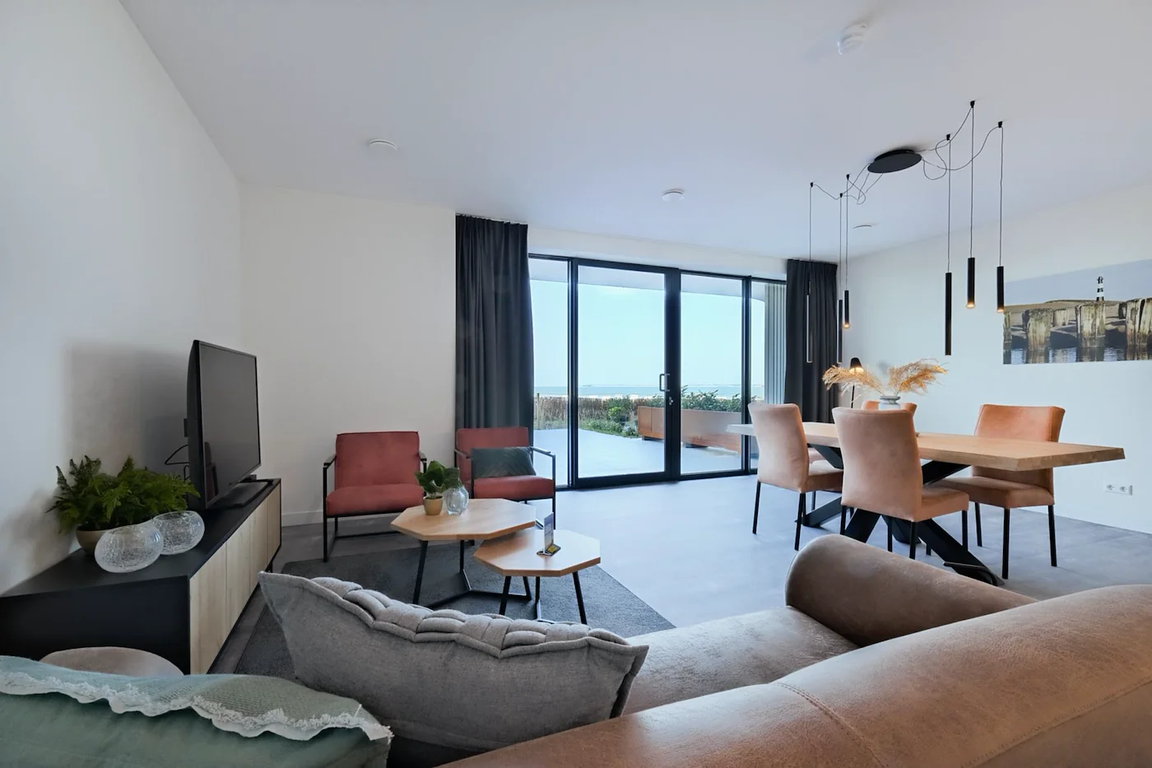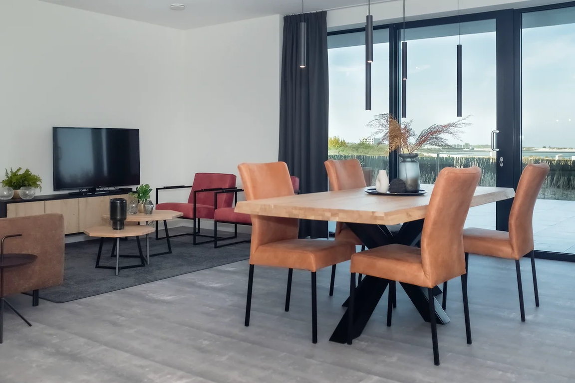 Entspannung im Breskens-Urlaub bietet die geräumige Ferienwohnung „Dunes Terrace“ für 4 Personen mit 2 Schlafzimmern und 2 Badezimmern, welche bequem über Treppe oder Aufzug erreichbar ist. Mit einer Fläche von ca. 98 m2 bietet sie unter anderem einen herrlichen Blick auf den Hafen. Das großzügige Wohnzimmer der Ferienwohnung Dunes Terrace verfügt über eine gemütliche Sitzecke sowie einen Essbereich. Hier finden Gäste auch einen Smart-TV, mit dem sie ihre bevorzugten Inhalte streamen können. Die moderne offene Küche ist komplett ausgestattet mit einer Kühl-Gefrierkombination, einem Kombi-Backofen, einer Nespresso-Maschine und einer Geschirrspülmaschine. Zwei Terrassen gehören zur Ausstattung der Ferienwohnung, die im Erd- oder Grundgeschoß des Appartementkomplexes liegt. Vom Wohnzimmer aus gelangen Urlauber auf die Terrasse mit Blick auf die Westerschelde, den Strand und die Dünen, von denen sie abends wunderschöne Sonnenuntergänge erleben können. Die zweite Terrasse ist von beiden Schlafzimmern aus zugänglich und bietet unter anderem einen Blick auf den Hafen von Breskens. Beide Terrassen sind mit Gartenmöbeln ausgestattet, perfekt zum Entspannen nach einem erlebnisreichen Tag in Zeeland oder für gemeinsame Abendessen im Freien!