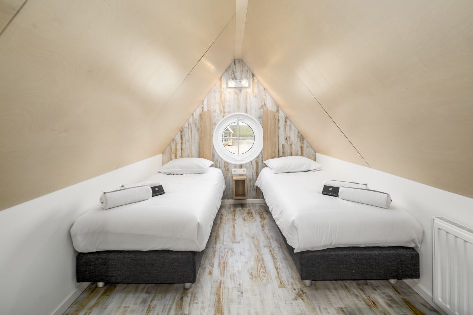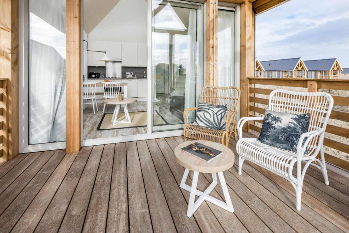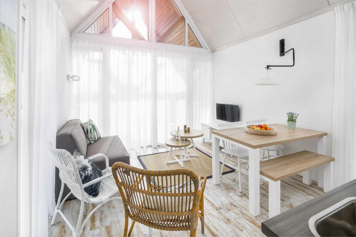 Die als erstes errichteten 40 „Beach Lodges“ im „Beach Resort Nieuwvliet-Bad“ bieten ab 246,- € pro Kurzwoche maritimen Wohnkomfort auf 37 Quadratmetern für bis zu vier Personen. Die auf 222 Quadratmetern Grundstücksfläche freistehenden Holzhäuser haben zwei Ebenen mit einem Schlafzimmer und Badezimmer im Erdgeschoss und einem Schlafzimmer im Obergeschoss. Das Wohnzimmer mit Fußbodenheizung, Smart-TV-Gerät und großer Fensterfront geht über in eine überdachte Außenterrasse mit Lounge-Set, die aufgrund ihrer Südausrichtung von mittags bis abends Sonne hat.