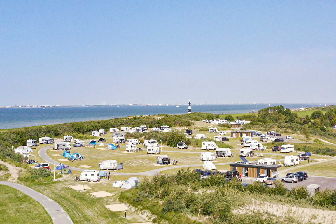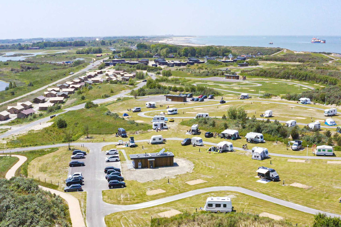 Über fünf Dünentäler verteilt bietet der Campingplatz des Molecaten-Ferienparks „Waterdunen“ bei Breskens 174 Stellplätze für das eigene Zelt, einen Wohnwagen oder einen Klappcaravan. Die Plätze liegen kreisförmig in den Dünen direkt hinter dem Deich bzw. dem nur in eine Richtung befahrbaren Panoramaweg zwischen Nieuwvliet und Breskens. Die circa sechs qm große Komfortstellplätze haben Wasser-, Strom- (10 Ampere) und Entwässerungsanschluss sowie WLAN. Jedes Dünental hat ein eigenes Saintärgebäude; die Müllsammelstelle liegt zentral an der platzinternen Zufahrtstrasse zwischen den Camping- und den Glampingplätzen. Maximal zwei Haustiere sind gegen Gebühr erlaubt, ist Parken auf dem zentralen Parkplatz des Ferienparks „Waterdunen“ möglich.