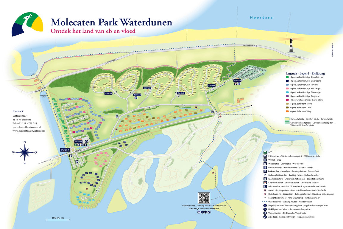 Im Naturferienpark „Waterdunen“ von Molecaten südlich von Breskens können seit Mitte 2023 Naturliebhaber mitten in den Dünen auf Campingstellpätzen oder im Ferienhaus in dem dem von Ebbe und Flut sich ständig verändernden Dünengebiet Waterdunen urlauben. Direkt hinter dem Deich im Schatten des Leuchtturms „Nieuwe Sluis“ schmiegen sich über 220 Camping- und Wohnmobilstellplätze mit Wasser- und Stromanschlüssen in sechs Dünentälern. Weiter landeinwärts erwarten 38 Glampinghütten für fünf bsi sechs Pesonen mit Komfortanspruch im Campingurlaub an einem kleinen Wasserlauf, der parallel zur Küste und zum Naturschutzgebiet verläuft. Und direkt am Rande des neu geschaffenen Naturgebietes liegen am Kanal der Gezeitenschleuse und auf einer Halbinsel der „Waterdunen“ Ferienhäuser für vier bis zehn Personen direkt am Wasser mit Blick auf Dünen, Fauna und Flora. Die Zu- bzw. Abfahrt zum Ferienpark ist nur in einer Richtung möglich, die Unterkünfte liegen alle an ruhigen Stichstrassen bzw. Wendehammern, die nur die Anwohner nutzen. Der Strand mit Blick über die Westerschelde ist ebenso fußnah wie die Wanderrouten durch das Naturschutzgebiet; das Ortszentrum von Breskens nordöstlich vom Ferienpark ist mit dem Fahrrad in zwanzig Minuten erreichbar.