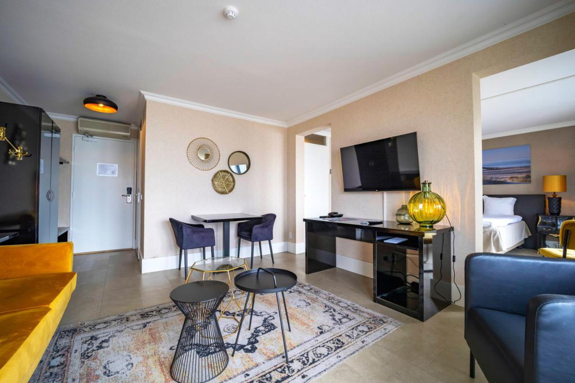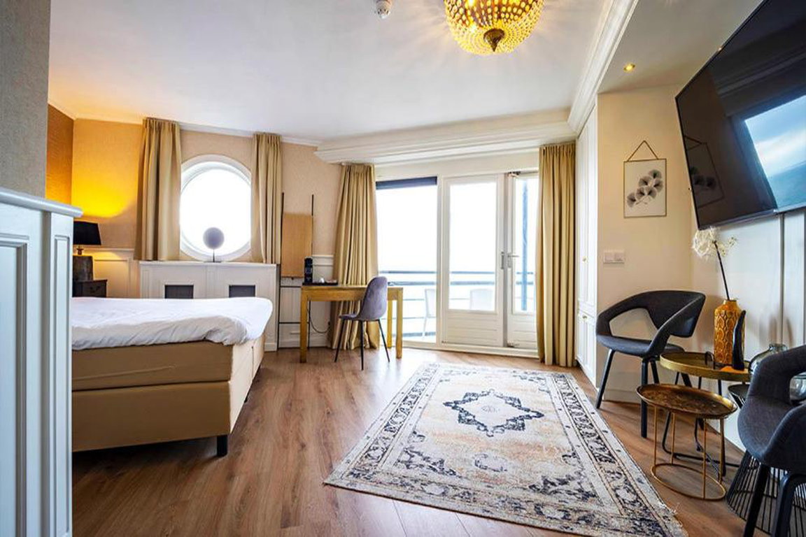 Auch die 40 qm großen Junior Suiten mit Meerblick und Balkon mit Blick auf die Nordsee und die Westerschelde. Die Suiten sind mit einem komfortablen Boxspringbett (2,10 Meter), Klimaanlage, Flachbild-TV, Sitzgelegenheit, Schreibtisch, Kühlschrank und Safe und einem modernen Badezimmer mit Badewanne mit Dusche ausgestattet.