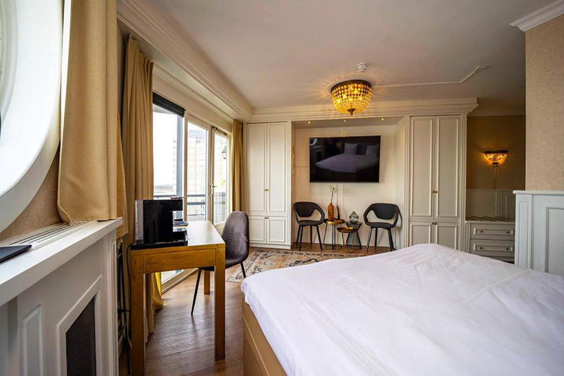 Die geräumigen Doppelzimmer bieten auf 30 qm ein komfortables Boxspringbett (2,10 Meter), Flachbild-TV, Klimaanlage, Sitzgelegenheit, Schreibtisch und Safe sowie ein Badezimmer mit Badewanne oder Dusche und einen herrlichem Blick über die lebendige Hafenstadt Vlissingen oder einen Blick über die Westerschelde und die Nordsee.