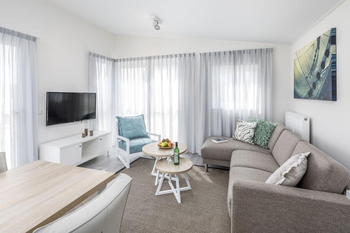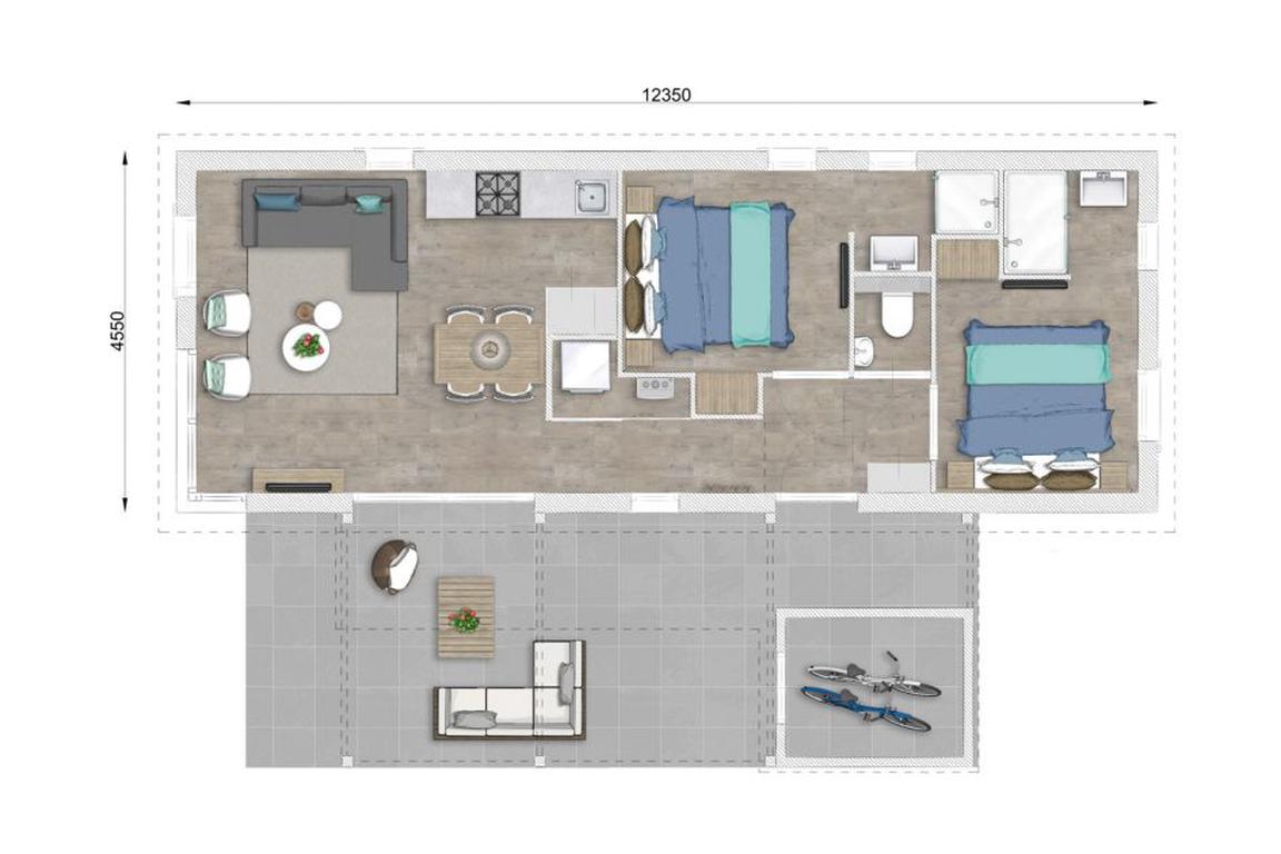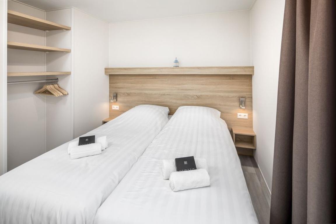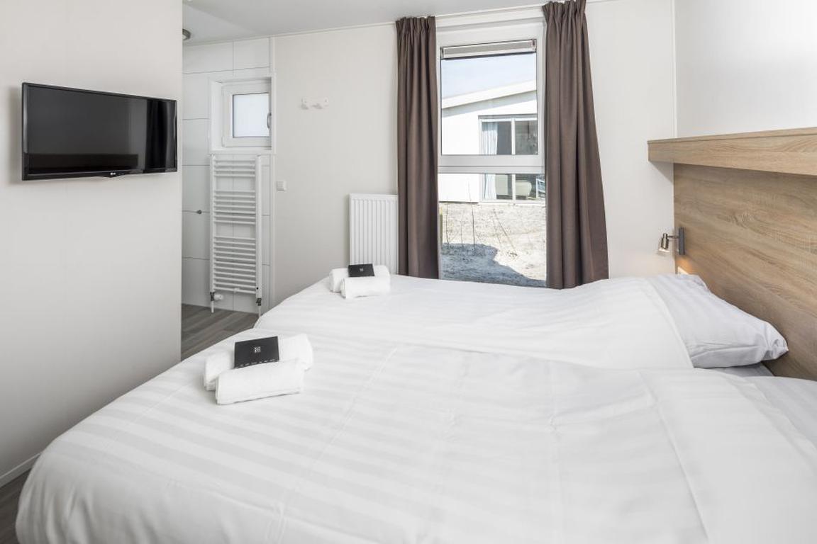 Die eingeschossigen Lodges L4A im neuen Ferienpark „Beach Resort Nieuwvliet-Bad“ bieten auf 56 Quadratmetern Grundfläche Platz für vier Personen mit zwei Schlafzimmern inklusive komfortablen Boxspringbetten und jeweils einem eigenem Badezimmer mit Dusche. Ein Schlafzimmer ist mit einem TV Smart-Gerät ausgestattet, ein separates Gäste-WC sorgt für ungestörten und stresslosen Hygienebetrieb im Nieuwvliet-Urlaub. Das modern eingerichtete Wohnzimmer grenzt an die offene Küche an und bietet einen gemütlichen Sitzbereich mit einem Sofa über Eck und einem Couchtisch sowie einem Esstisch mit Sitzmöglichkeiten für vier Personen.