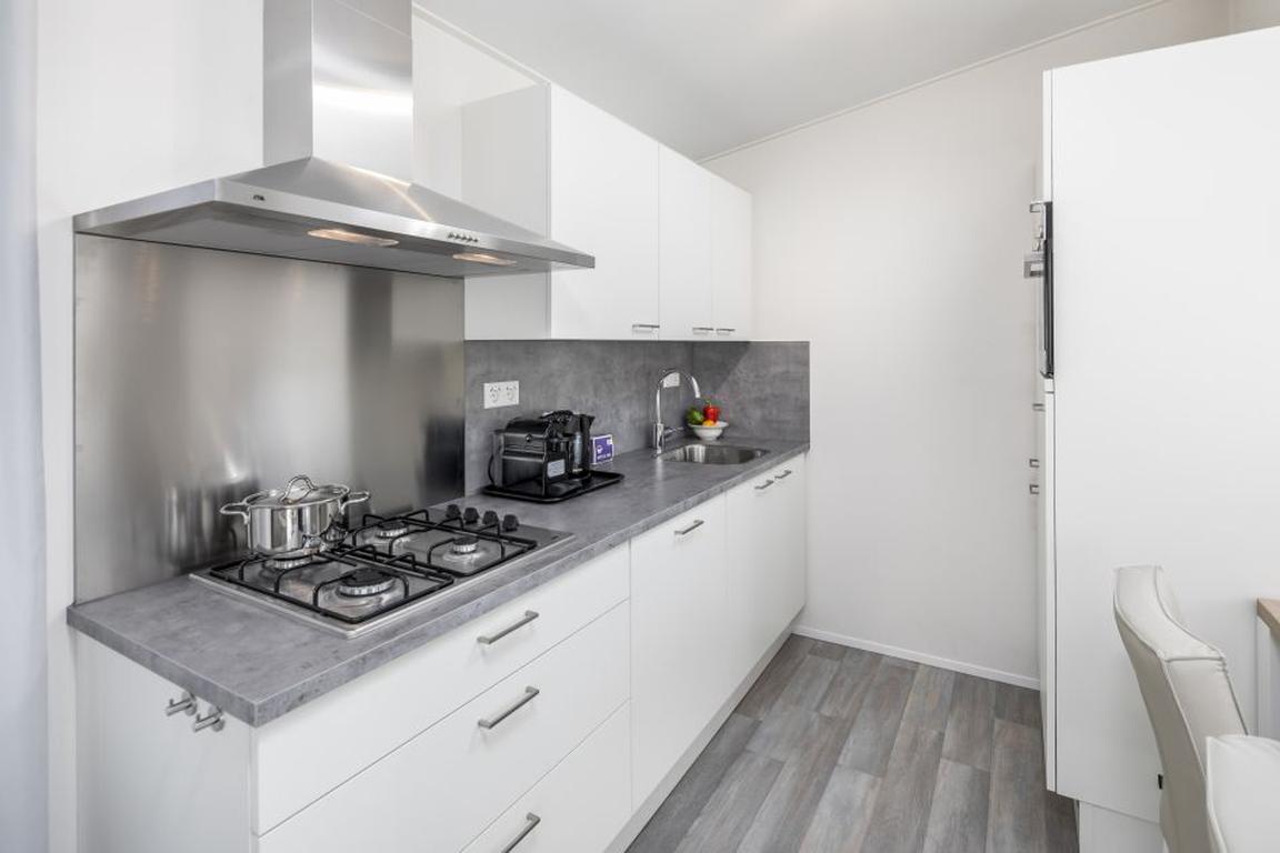 Die Küche ist modern und praktisch eingerichtet mit vierflammigen Gasherd, Dunstabzugshaube, Wasserkocher, Nespressomaschine, Kühlschrank mit Gefrierfach, eingebauter Kombi-Mikrowelle und Geschirrspüler. Waschmaschine und Trockner sind ebenso vorhanden wie ein Abstellraum für zwei Fahrräder.