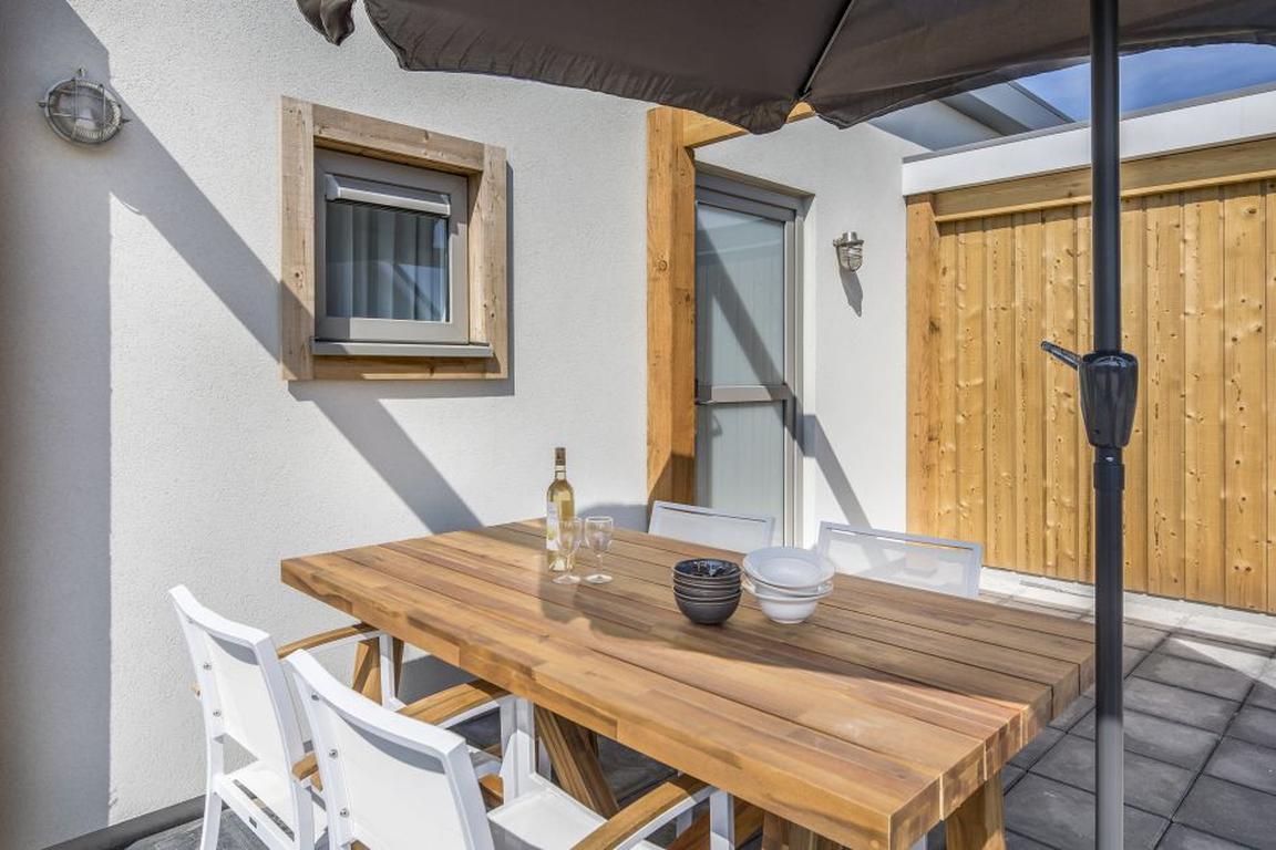 Das Wohnzimmer bietet mit Schiebetüren bequemen Zugang zur Terrasse mit Pergola und dem Garten, Gartenmöbel und Sonnenschirm sorgen für komfortable und entspannte Nutzung des Aussenbereiches der Lodges 4A. Zur Lodge gehört auch ein Stellplatz für einen PKW, WiFi/WLAN ist gratis. Einige der insgesamt 24 Lodges, die vorrangig im nordöstlichen Teil des „Beach Resort Nieuwvliet-Bad“ liegen, haben zusätzlich Terrassenheizer, Lounge-Möbel, Sonnenliegen und Klimaanlage. Je nach Lodge-Typ sind Haustiere wie Hunde oder Katzen willkommen.