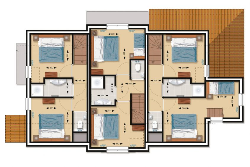 Im Obergeschoss des Maxi-Bungalows in der „Noordzee Residence Cadzand-Bad“ befinden sich sechs Schlafzimmer jeweils mit Doppelbett, eines davon mit einem zusätzlichem Einzelbett; über das sechste Schlafzimmer erreicht man das Turmzimmer mit Einzelbett und Rundumsicht. Auf dieser Ebene gibt es ausserdem drei Badezimmer mit Dusche und drei separate Toiletten. Der Bungalow ist gut für Kinder gerüstet: Er ist mit einem Kinder-Plus-Paket ausgestattet und verfügt über drei Campingbettchen (ohne Matratze), drei Kinderstühle, drei Laufställe, drei Kinderbadewannen und Bollerwagen, ein Treppengitter, kindersichere Steckdosen und einen komplett eingezäunten Garten. Eine HiFi-Anlage mit DVD-Player und kostenloser Internetanschluss sind wie bei allen Villen, Bungalows und Ferienhäusern in der „Noordzee Residence Cadzand-Bad“ vorhanden.