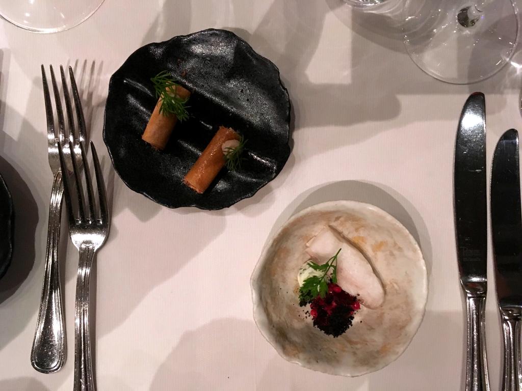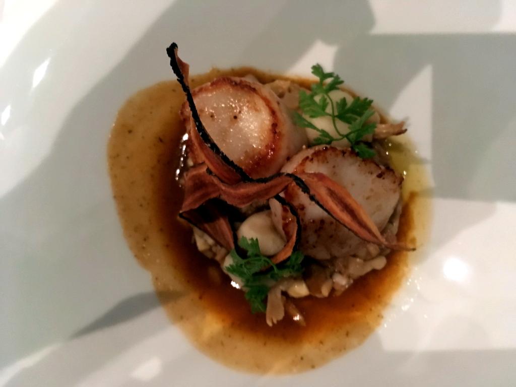 Bei unserem Besuch begrüßte uns zum Start ein Amuse gueule-Trio: Zwei knackige Rote Beete-Chips, zwei Röllchen aus einer leichten Gänselebercreme und ein marinierter Rochenflügel, die die Vorfreude auf das folgende Drei-Gänge-Menü anfachte. Die realisierte sich vollumfänglich in der Vorspeise, die beide wählten: Auf den Punkt gegarte Coquille St. Jacques-Muscheln auf aromatischem Pulled Chicken mit in Butter geschwenkter Sellerie. Beim Hauptgericht schieden sich die Geister der beiden Gäste in der Wahl, aber nicht im Urteil über den Geschmack: Sanft geschmeidig-gegrillte junge Taube mit Kalbs-Brie an einer Banyuls-Soße, frischer Seebarsch kross auf der Haut gebraten. Beides perfekt im Geschmack, der durch ein dazu gereichtes Glas Chardonnay harmonisch abgerundet wurde. Auch beim Dessert eine zweigeteilte Wahl mit wieder einhellig gutem Urteil: Für das süße Leckermäulchen eine Mousse aus der Calamondinorange („Kalamansi“) mit Pistazzieneis, für den herben Dessertliebhaber ein perfekt komponiertes Käse-Quintett. Und dann zum Finale und dem am Tisch frisch gemischten Latte Macciato ein süßes Portfolio aus Mini Creme Brule, Vanille Creme, Macarons, Madelaines und italienischem Nougat, das jeden zum Naschen verführte.