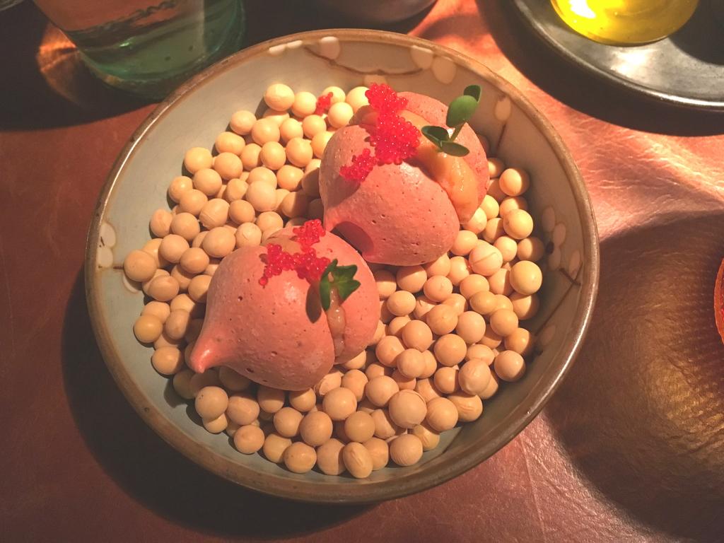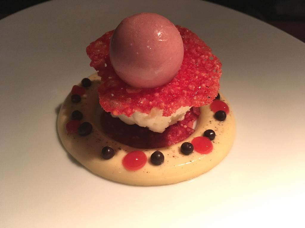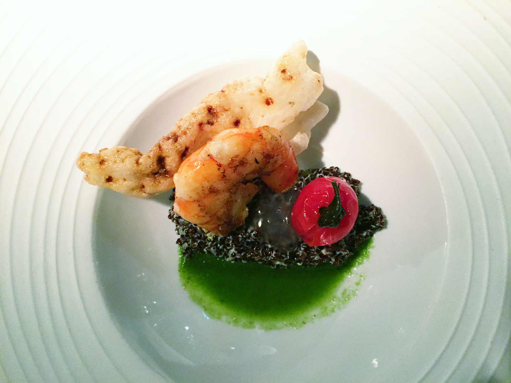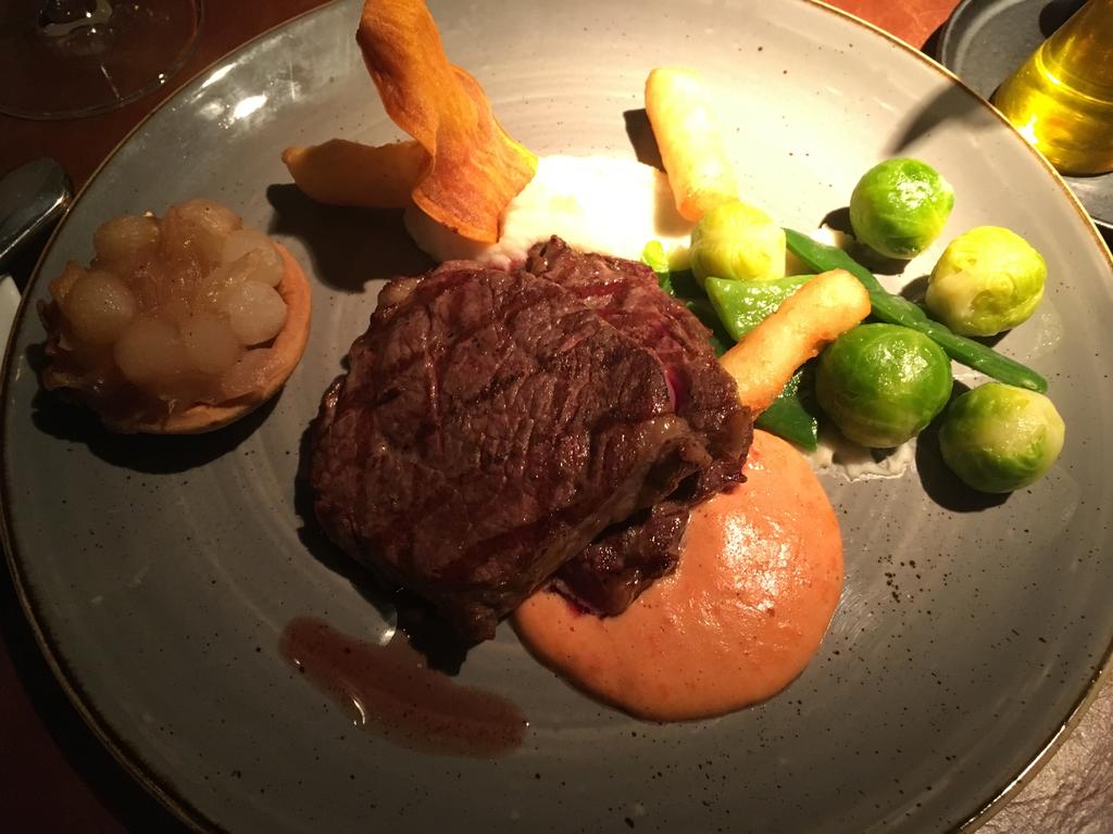 Zum Dinner entschieden wir uns jeweils für das Drei-Gänge-Menü, das mit einem mehrfachen wie schmackhaften Gruß aus der Küche eingeleitet wurde: Frisches, knusprig selbstgebackenes Brot plus einer cremigen Meeres-Salzbutter begleitet von einer marinierten Muschel und einer Rote-Beete-Macaron im XXL-Format. Die Menüfolge – ein Klassik-Exotik-Mix: Die Vorspeise kam exotisch daher, das Hauptgericht eher klassisch. Den Auftakt bildeten eine Riesen-Gamba auf einem kleinen Salat aus Quinoa, der sich über eine leichte Schnittbohnen-Mousse erhob. Die Kombination der flandrisch-frischen Garnelen mit der Superfood aus den Anden mundete ebenso wie sie überraschte. Klassisch auf den gewünschten Medium-Punkt gegrillt, erfreute dann das Rib-Eye serviert mit Pommes Dauphine, Rosenkohl und einer Schalotten-Tarte. Optisch wie geschmacklich farbig und vielfältig erfreute zum Abschluß das Dessert: Ein Panna Cotta-Ring aus Schokolade mit Kokoseis und einer Himbeercreme – ansehnlich hübsch zu einem Türmchen in die Höhe angerichtet und dekoriert.