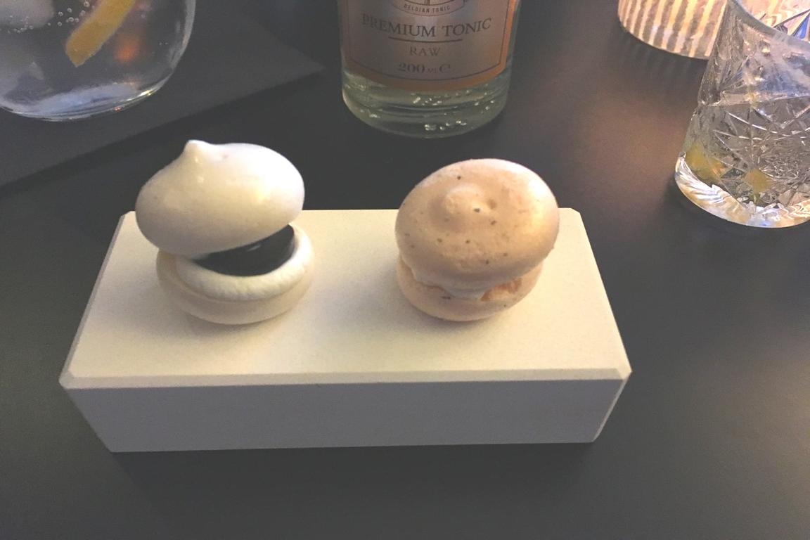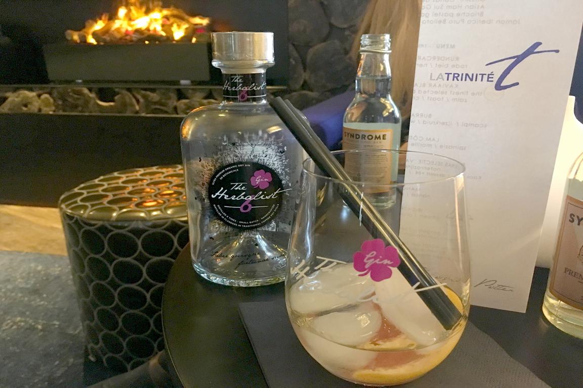 Empfangen wurden wir sehr freundlich in der Bar-Lounge mit Kamin, die mit indigo-blauen-roten Sesseln, weißen Vasen, dunklen Wänden und der luxuriös-cool-modernen aber auch gemütlich-chilligen Stimmung ein ebenso hohes kulinarisches Erlebnis erwarten lässt. Die Geschmacks-Reise startete das „La Trinité“-Team um François de Potter mit einem Trio als Gruß aus der Küche: Wasabi- Schaum mit Nüssen und Aprikose, einem Macaron-Duo mit Bloody Mary- und Kapern-Oliven-Ingredienzien – zwei Geschmacksshooter sehr gegensätzlicher Art, die Lust auf mehr „La Trinité“ machten. Dazu genehmigten wir uns passend einen Gin Tonic mit „The Herbalist“-Gin mit 50 Kräutern und ein „Syndrome Premium Indian Raw Tonic“-Wasser aus der umfangreichen Barkarte.