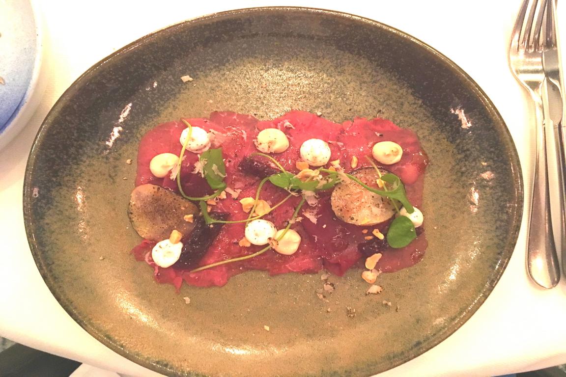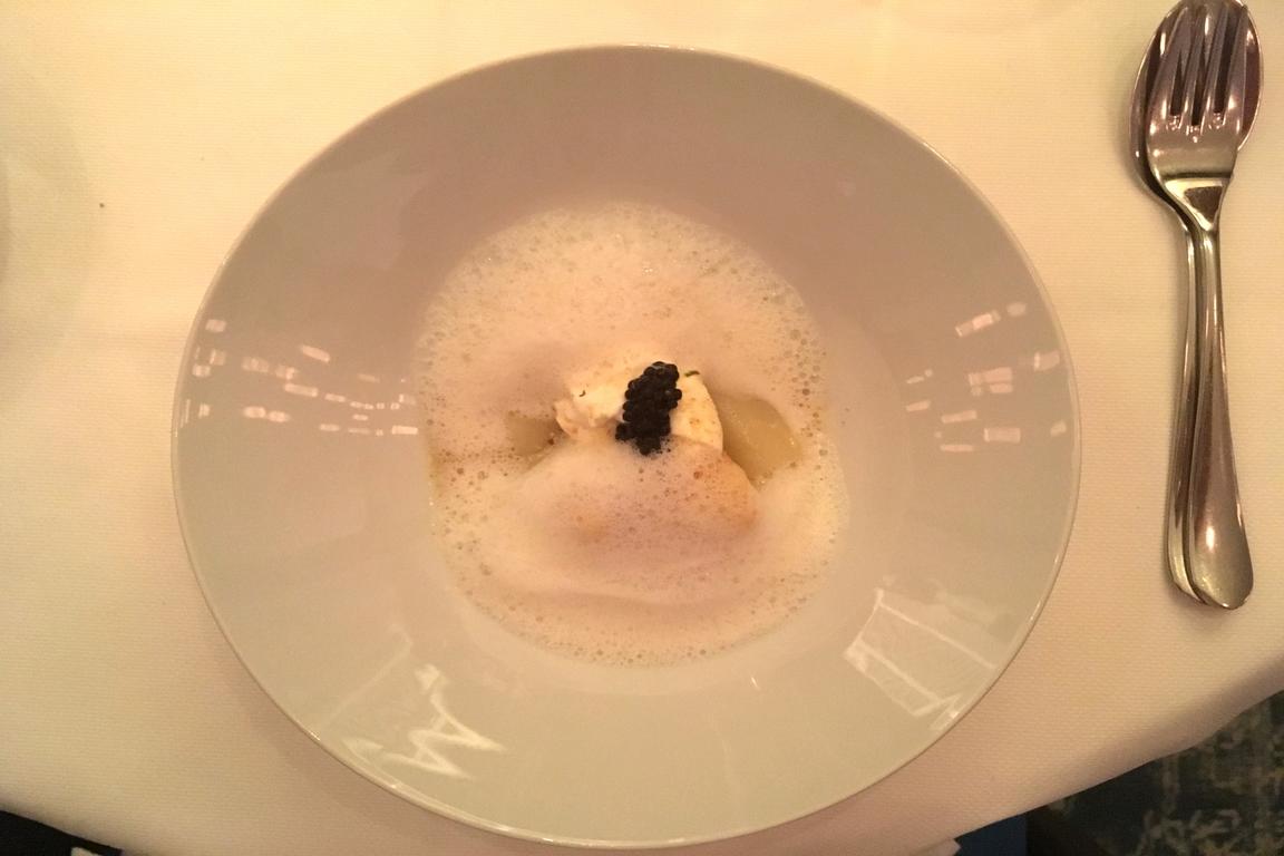 Die Führung unserer kulinarischen Reise im „La Trinité“ übernahm das am Samstag ausschließlich angebotene Menü, das aus fünf Gängen besteht, aber individuell erweitert werden konnte (75, -€). Als Vorspeise erfreute uns ein Rindercarpaccio mit Rote Beete, Trüffelöl und Nüssen: Sehr solide und schmackhaft – aber nicht wirklich ungewöhnlich oder gar sterneverdächtig. Als zweite Vorspeise wurde uns dann gereicht ein Burratta mit Scampi, weißem Spargel aus der Zwingregion, eingehüllt und überdeckt von zartem Spargelschaum. Unser Urteil auch hier: Solides Kochwerk auf hohem Niveau – aber ohne „Aha“- oder „Woah“-Effekt.